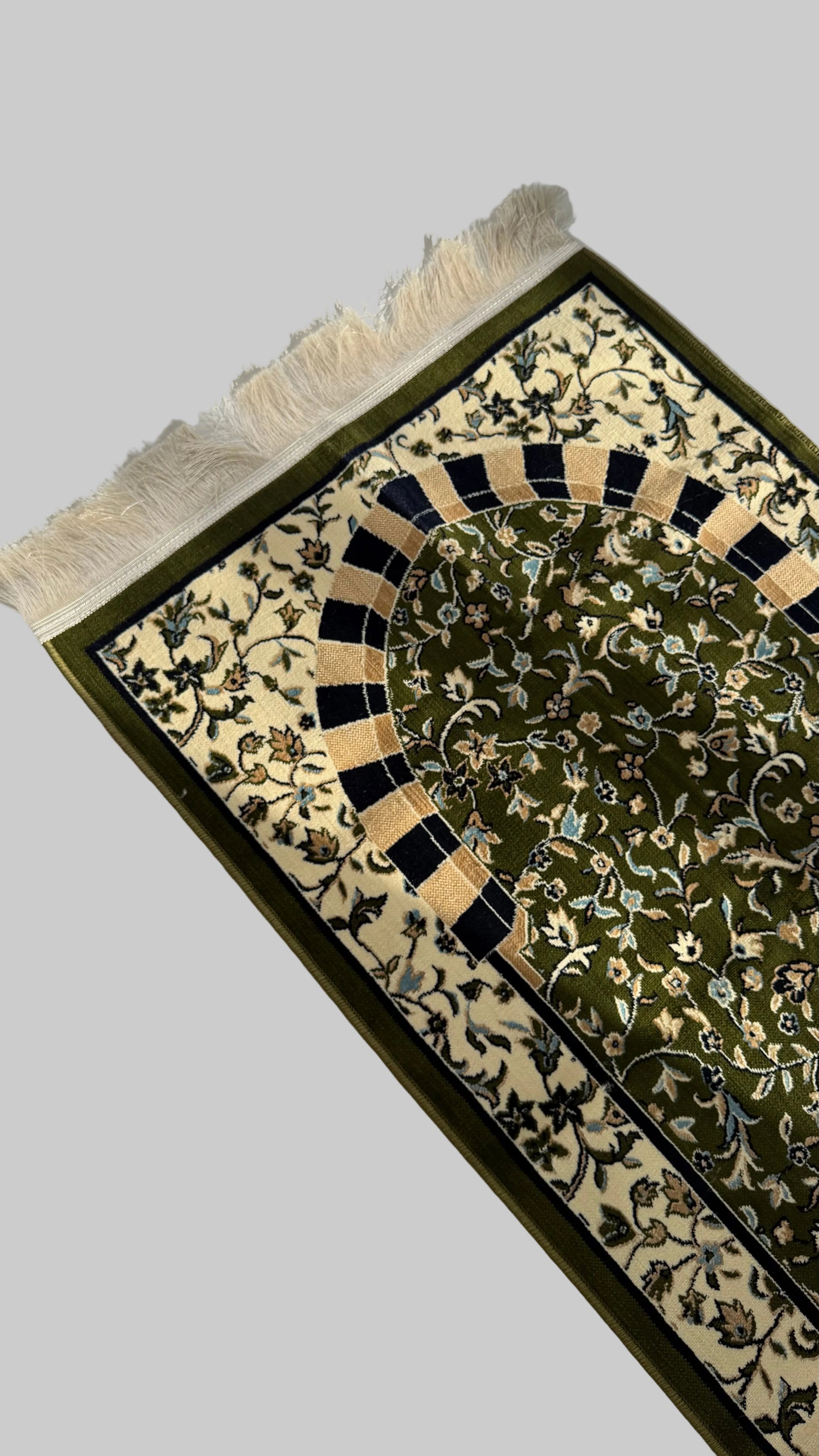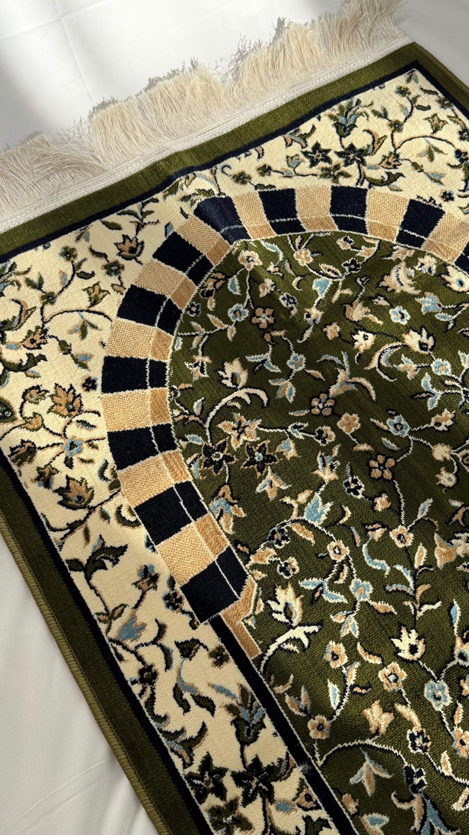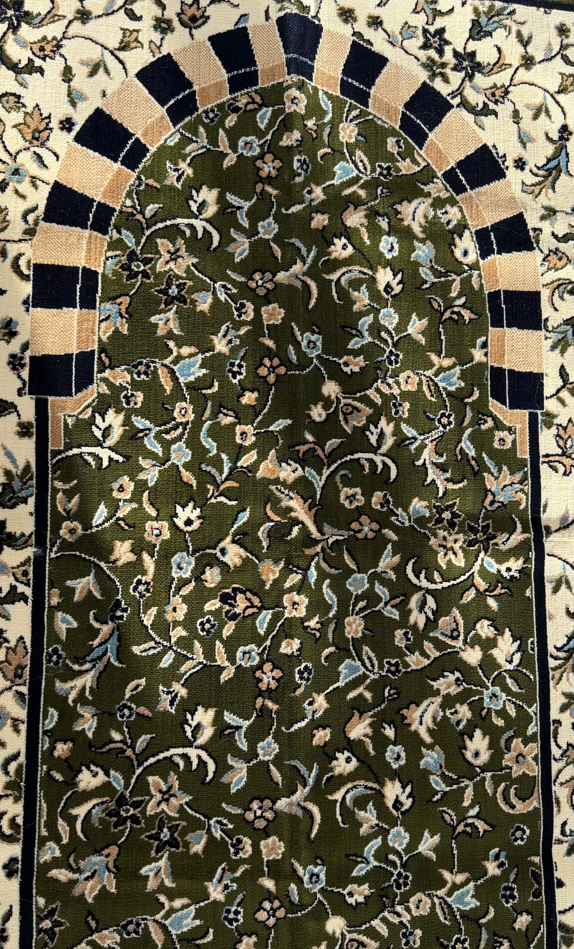 Son fond vert profond, sublimé par des détails beiges et bleu crée une harmonie visuelle apaisante, idéale pour se recentrer lors de chaque prière.